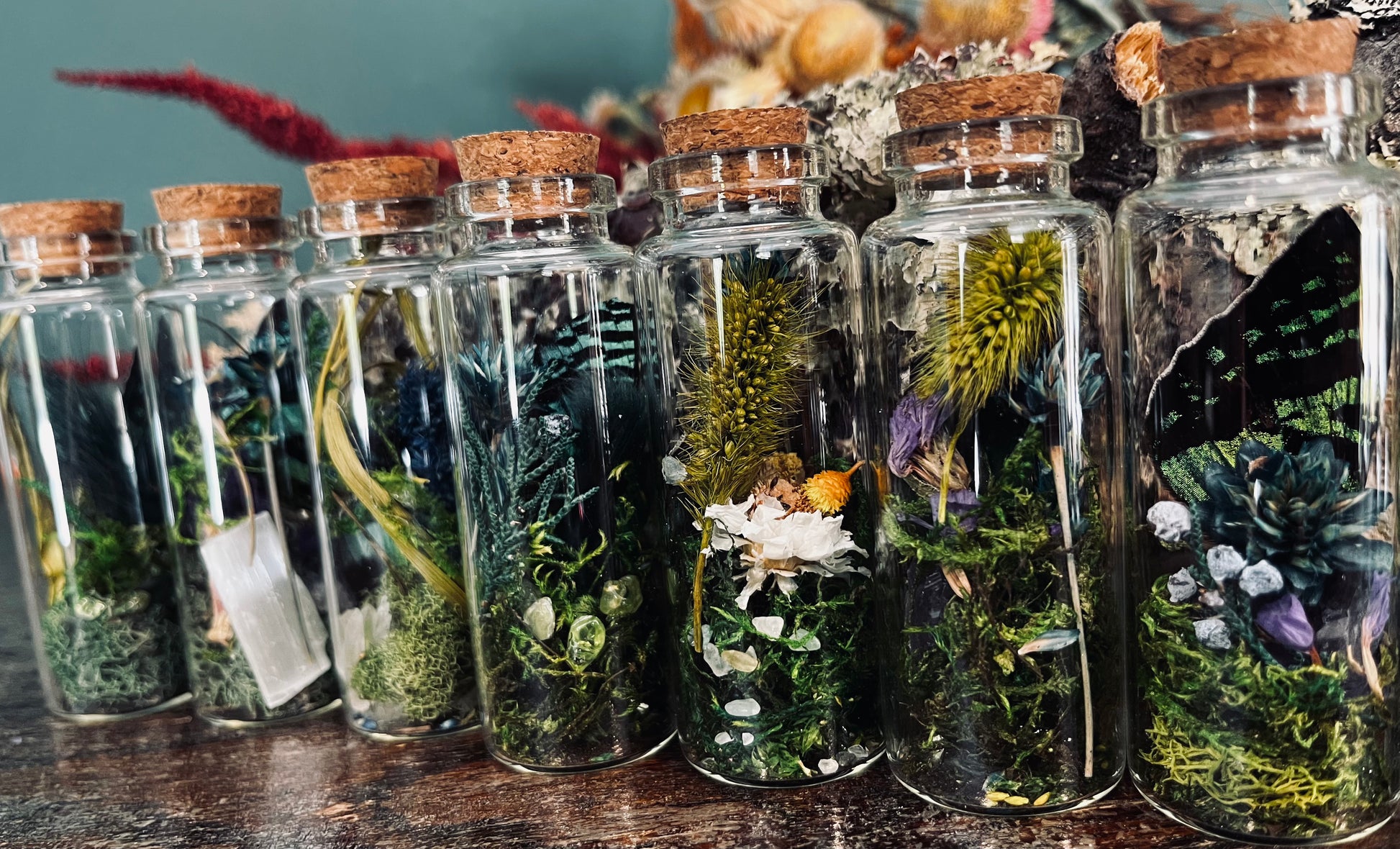 Each jar is a unique treasure and the florals within will shift with the seasons, ensuring that no two are ever alike, but every piece holds a whisper of woodland and nature based glamour.
