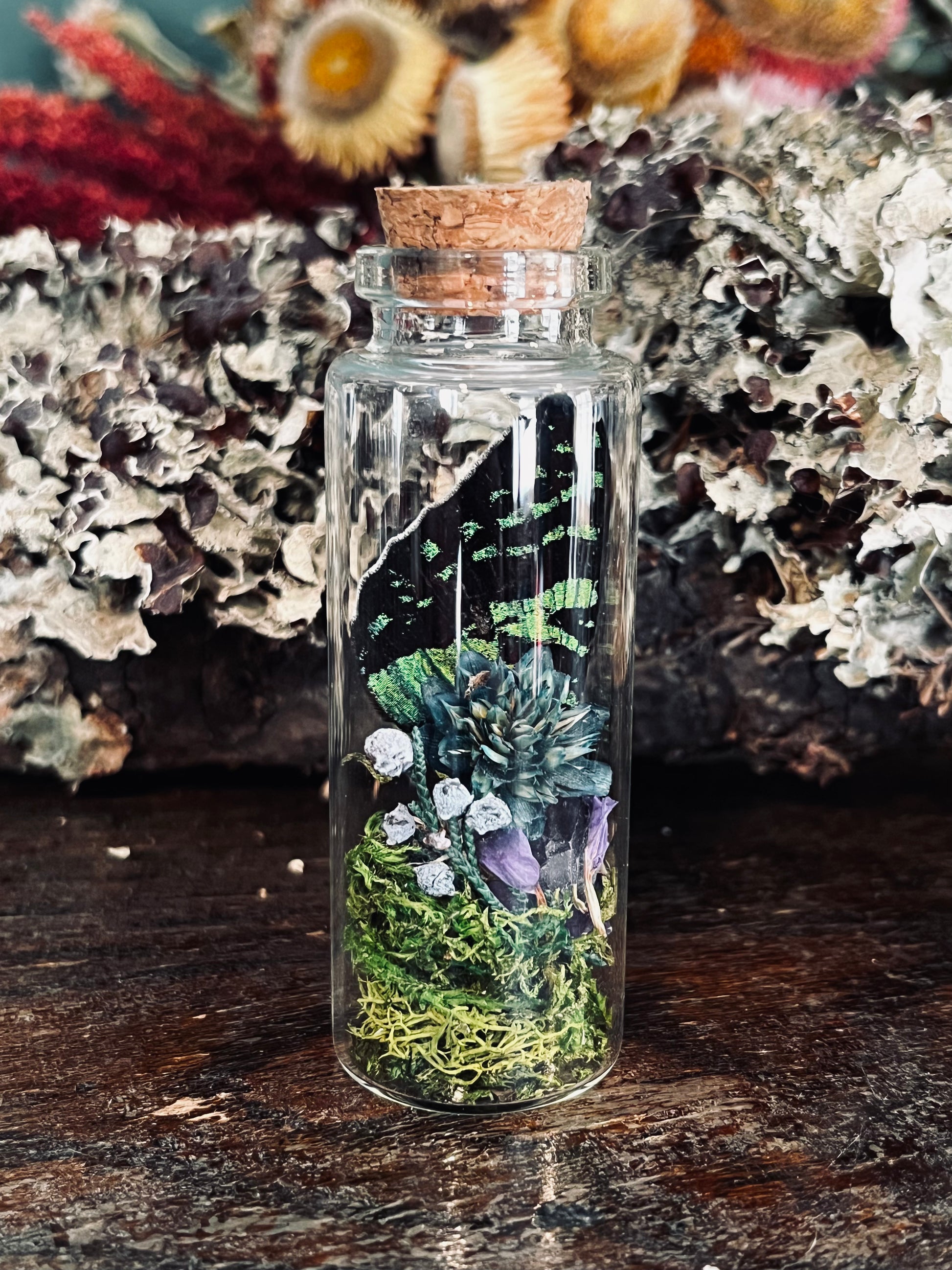 Ethically sourced and preserved within a tiny glass vessel, these wings are forever frozen in time amidst a bed of wild florals, glistening crystals, and soft moss. Choose the ethereal top wing, shimmering with hues of emerald and sapphire, or the mystical bottom wing, a radiant display of nature’s own rainbow.