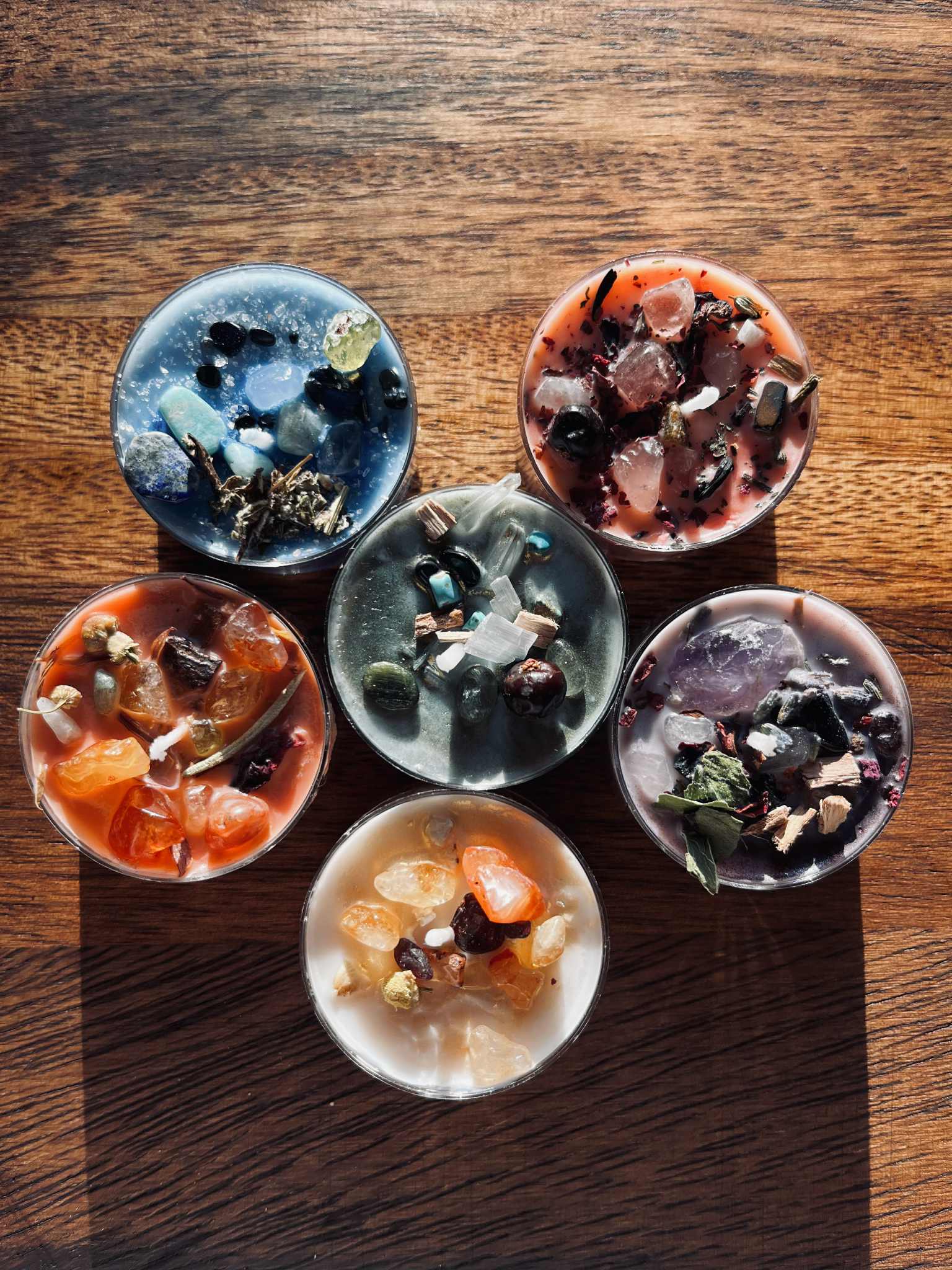 A sacred offering for the altar, hearth, or heart—this six-piece tealight set is a journey through the many faces of the Divine Feminine. Each candle is hand-poured from natural soy wax, colored with glimmering mica that dances in the flame, and crowned with crystals and herbs carefully chosen to honor the essence of a specific Goddess.