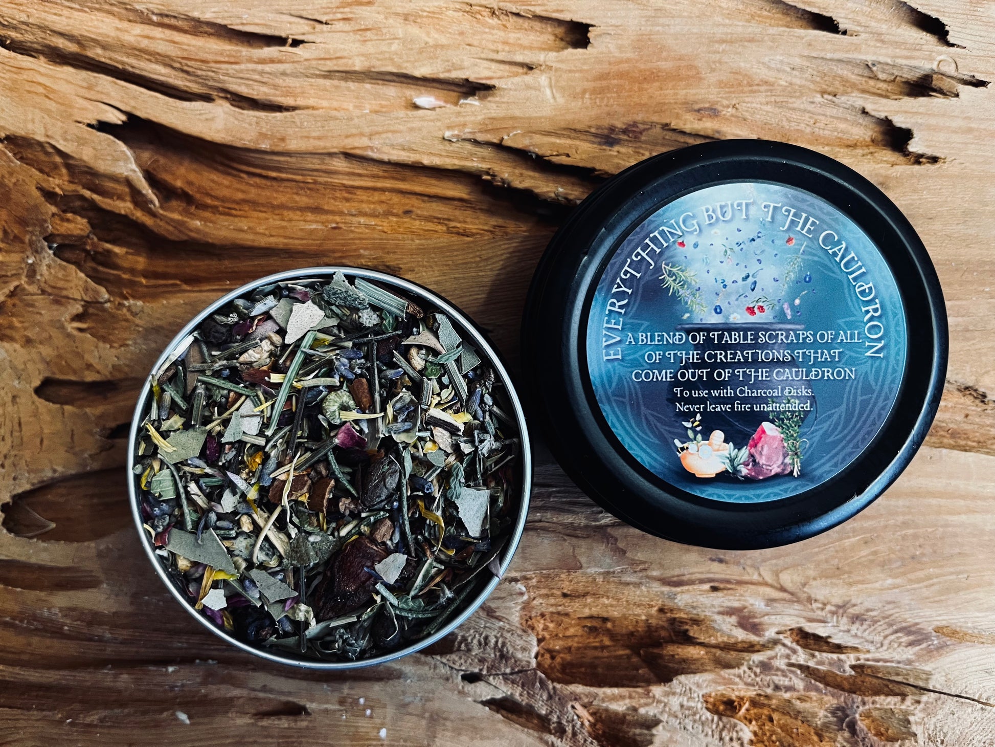 Everything but the Cauldron is a wild, chaotic symphony of botanicals, resins, herbs, stems and roots—a mysterious incense blend for the bold-hearted practitioner who wants it all. Inspired by the phrase “everything but the kitchen sink,” this blend throws caution to the wind and fills your senses with a spellcaster’s dream: rich woods, dark florals, earthy herbs, and hints of smoke, spice, and sweetness all woven together in a fragrant, alchemical frenzy- each portion guaranteed to be unique and a little different than the next.