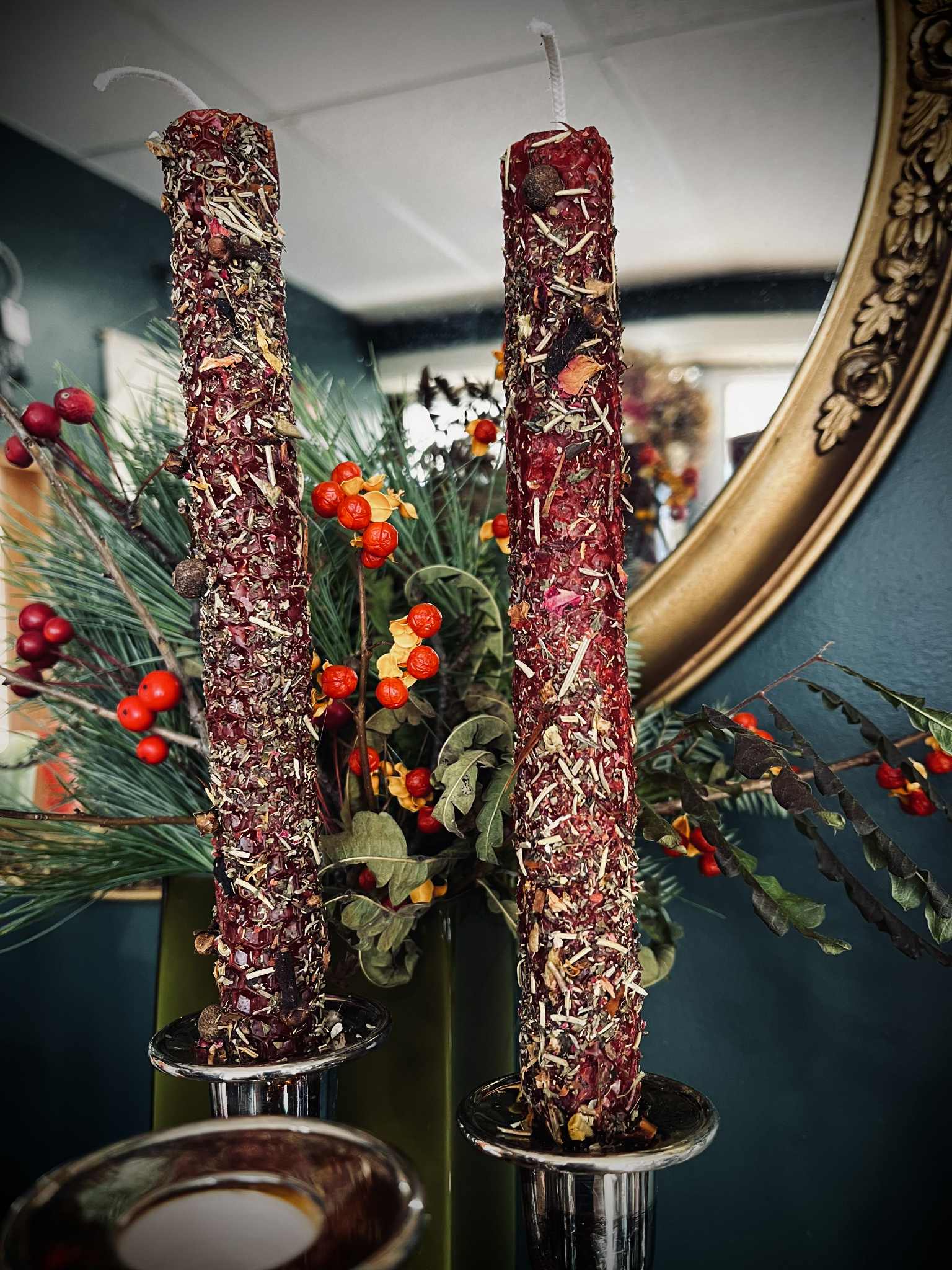 Contains two 8" hand rolled herbal & floral dressed tapers with a cotton wick