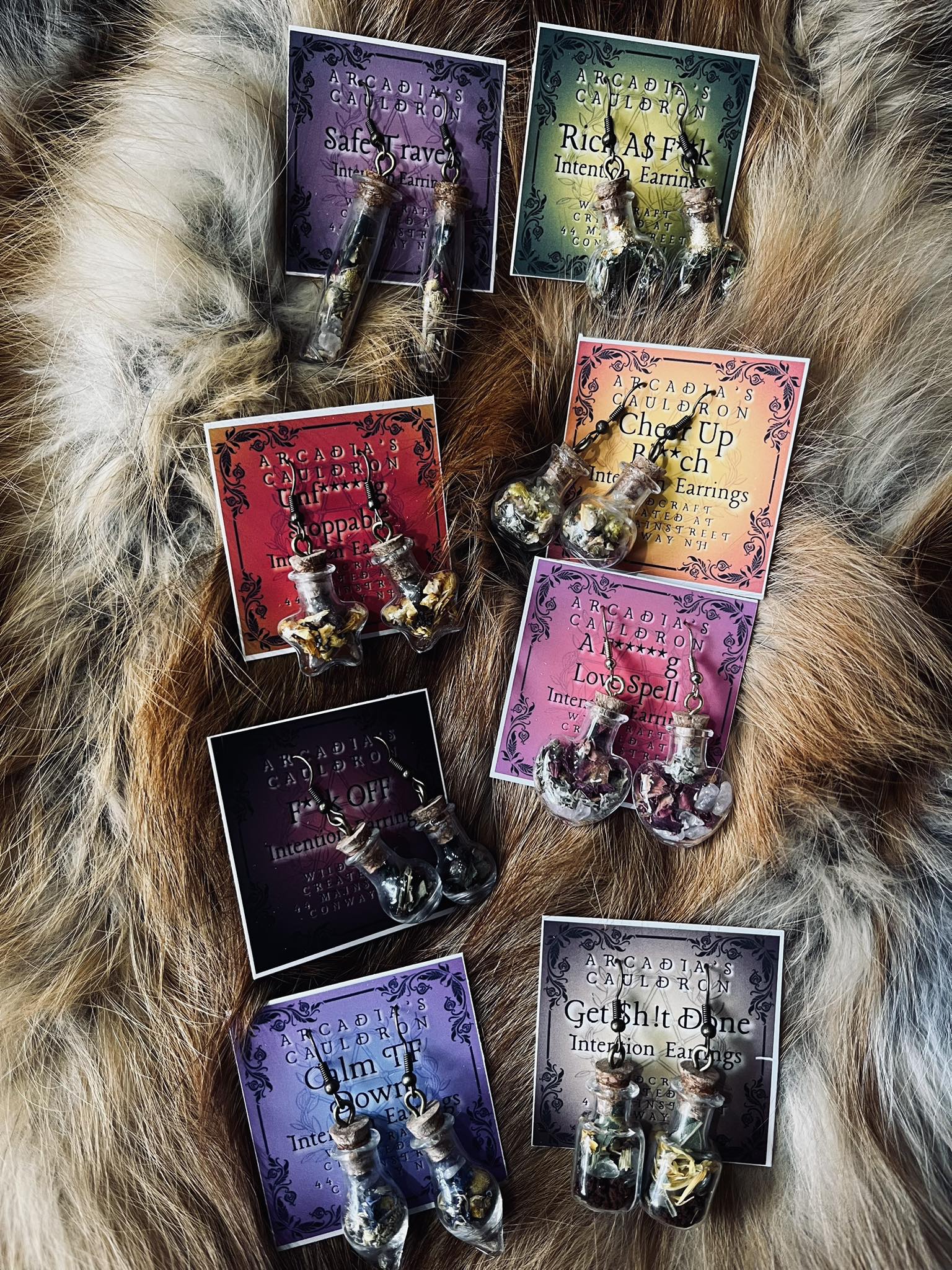 Tiny glass jar earrings, each a little slightly rude, aggressive, blunt world of its own. No two jars are exactly the same—some short and round, others tall and twisty—filled with handpicked herbs and crystals chosen to align with specific intentions like love, protection, happiness, lust, energy/aura cleanse, third eye and victory/success. Every pair is a wearable charm filled to the brim with color magic. Finished with hypoallergenic hooks, these earrings come in silver or gold and brown so please specify in a note which you would prefer. Also, if you need a censored version of these for a gift, please make a note for that as well. We think the choice words add a little...flair and attitude, but we understand that is not for everyone.