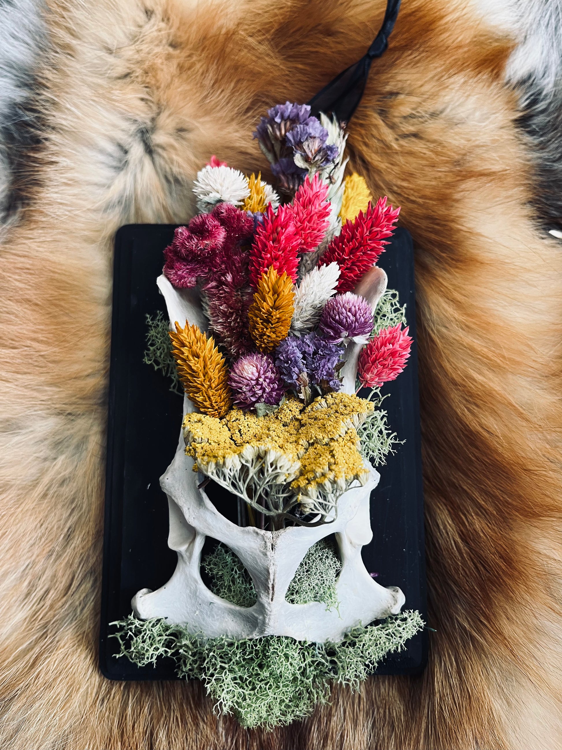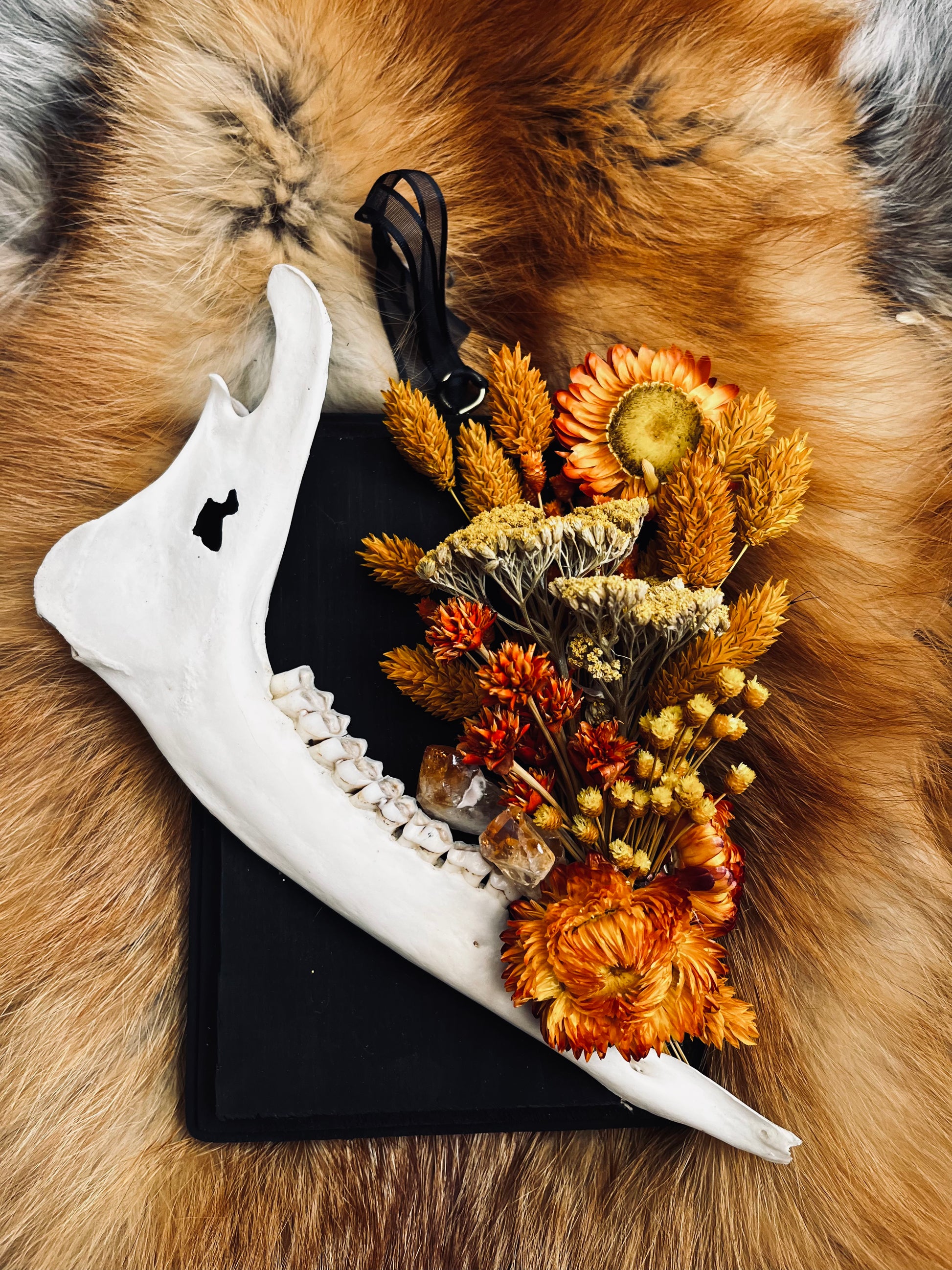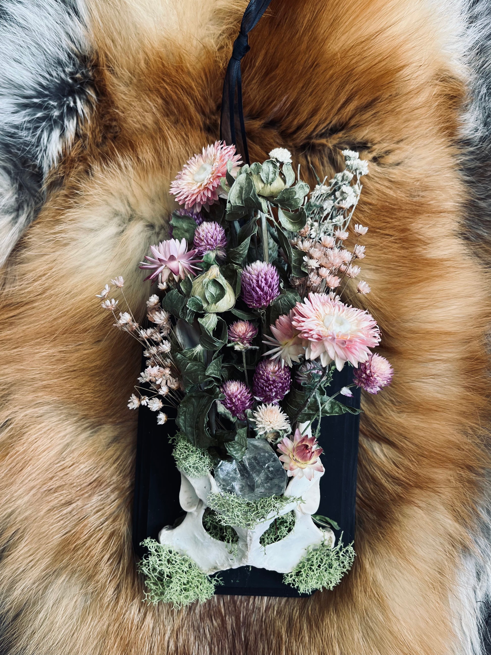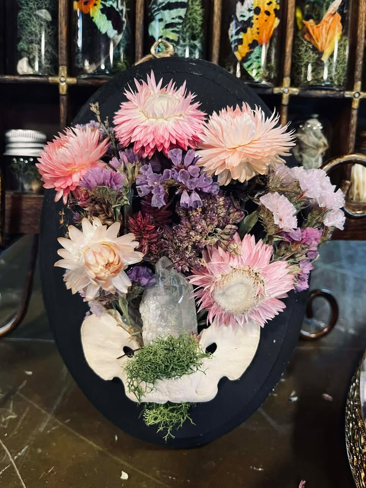 These handcrafted plaques blend natural beauty with a touch of the macabre, featuring ethically sourced bones from local fauna, carefully arranged with dried florals and, on occasion, shimmering crystals. Each piece is a unique fusion of organic textures and delicate artistry, designed to bring a sense of wild elegance and quiet reverence for nature’s cycles to your space. Perfect as a statement piece or subtle altar accent, these plaques invite reflection on life, death, and transformation.