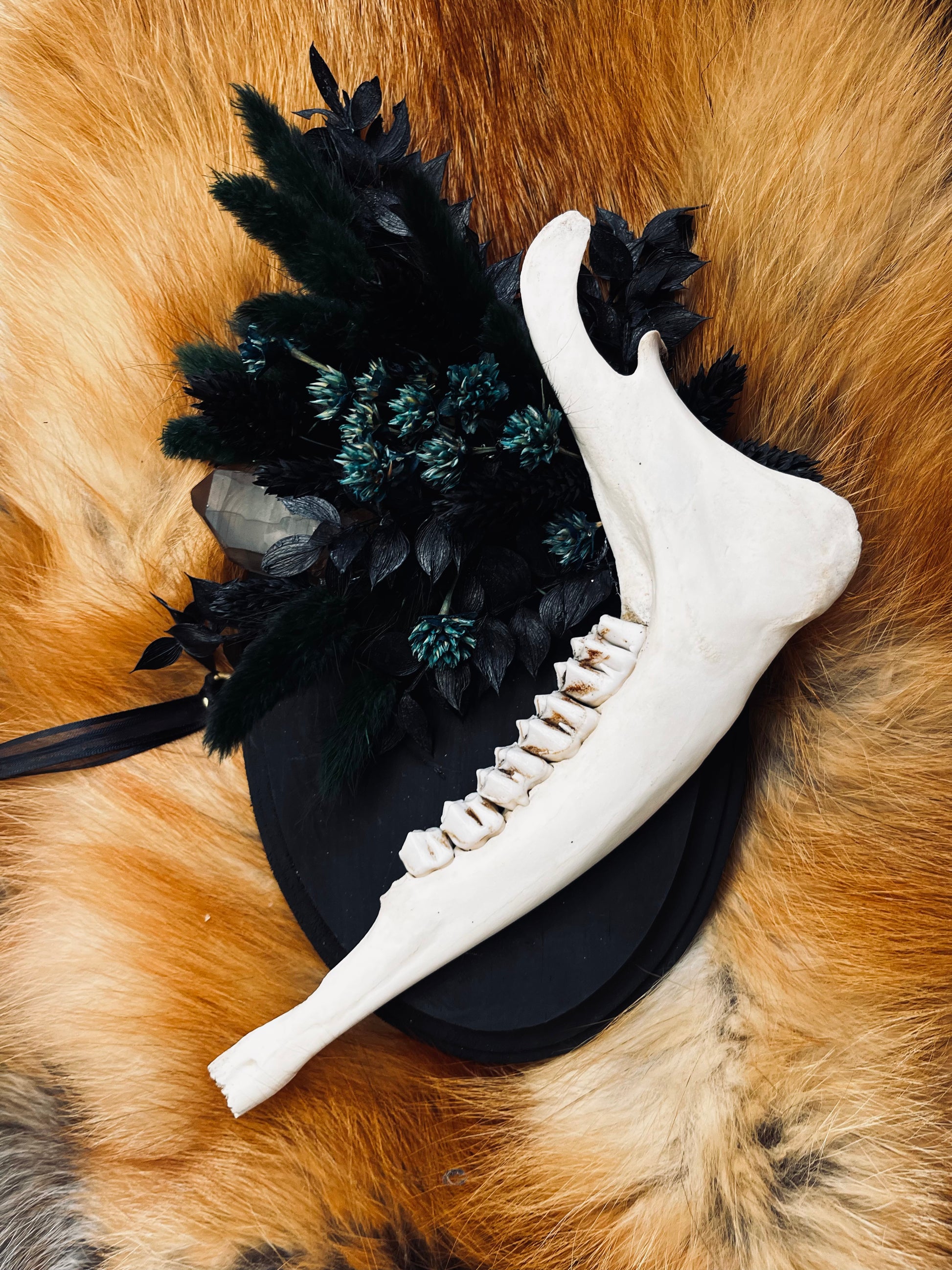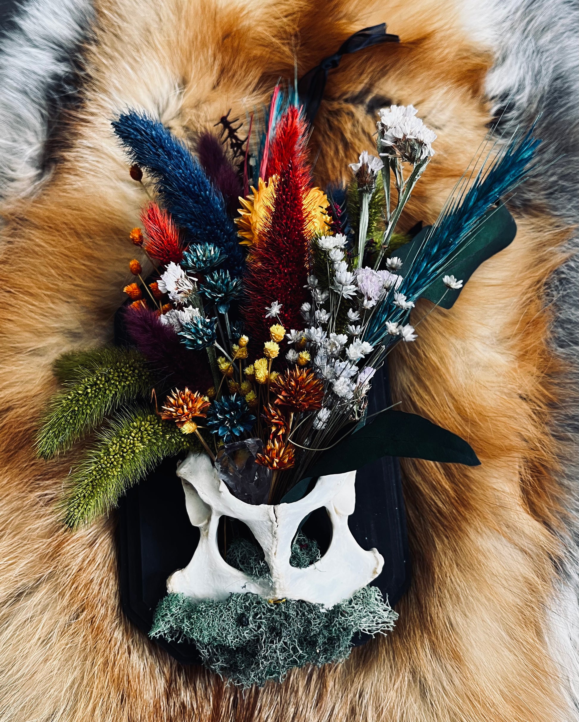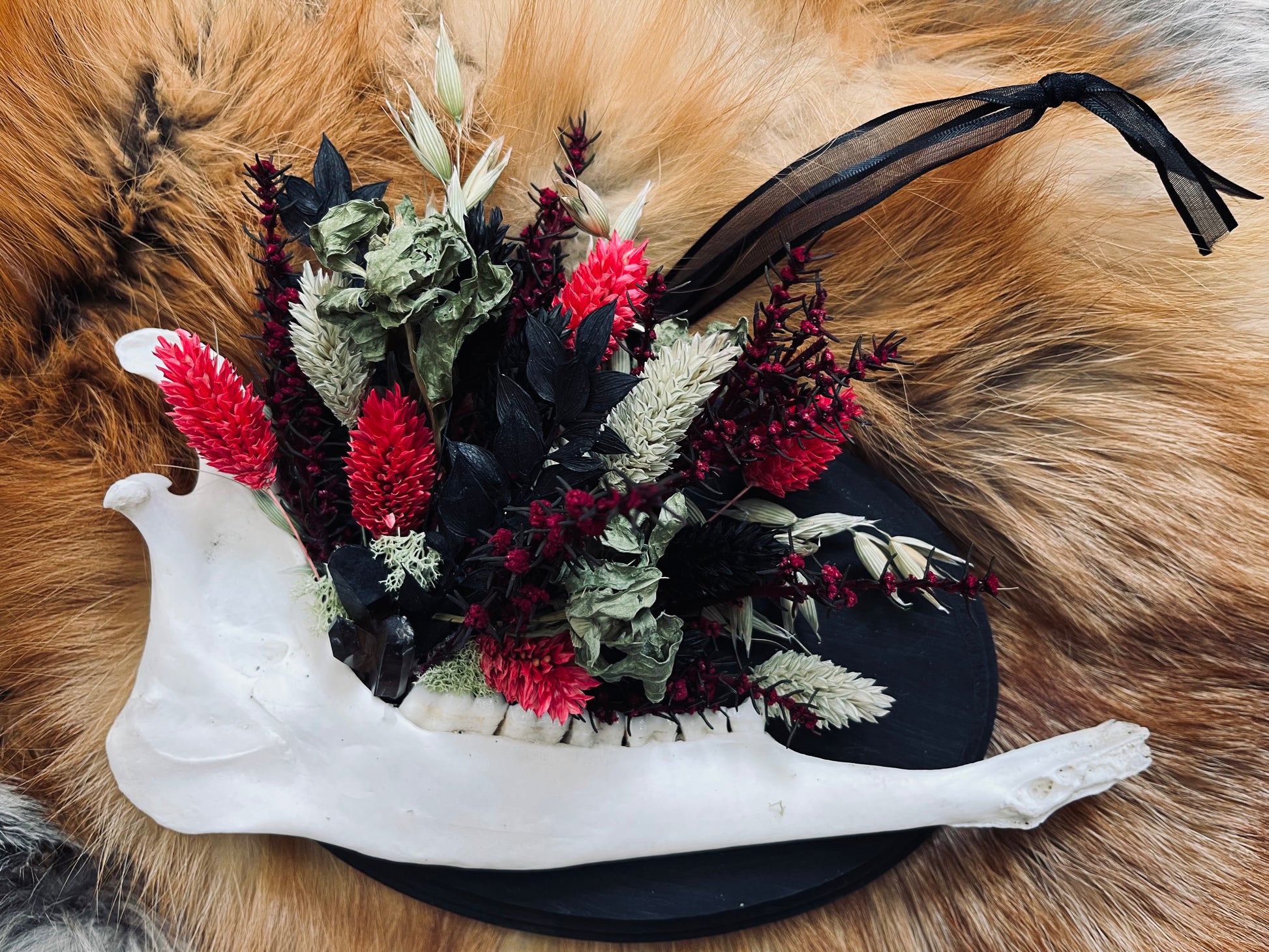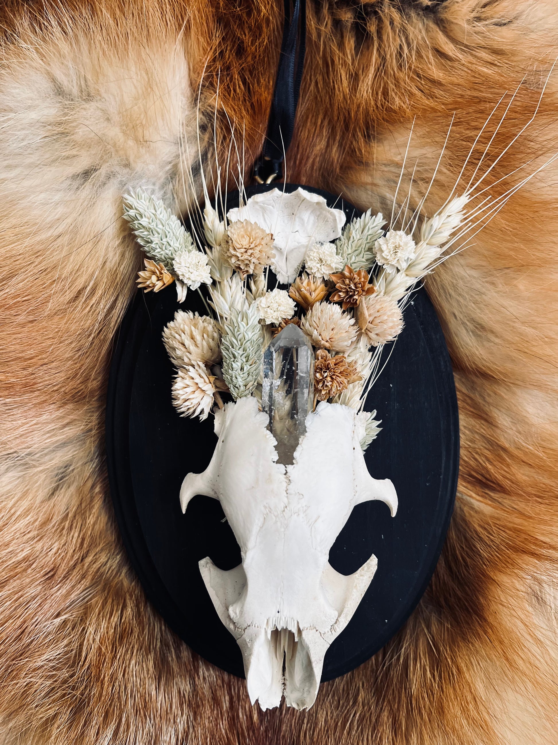 These handcrafted plaques blend natural beauty with a touch of the macabre, featuring ethically sourced bones from local fauna, carefully arranged with dried florals and, on occasion, shimmering crystals. Each piece is a unique fusion of organic textures and delicate artistry, designed to bring a sense of wild elegance and quiet reverence for nature’s cycles to your space. Perfect as a statement piece or subtle altar accent, these plaques invite reflection on life, death, and transformation.