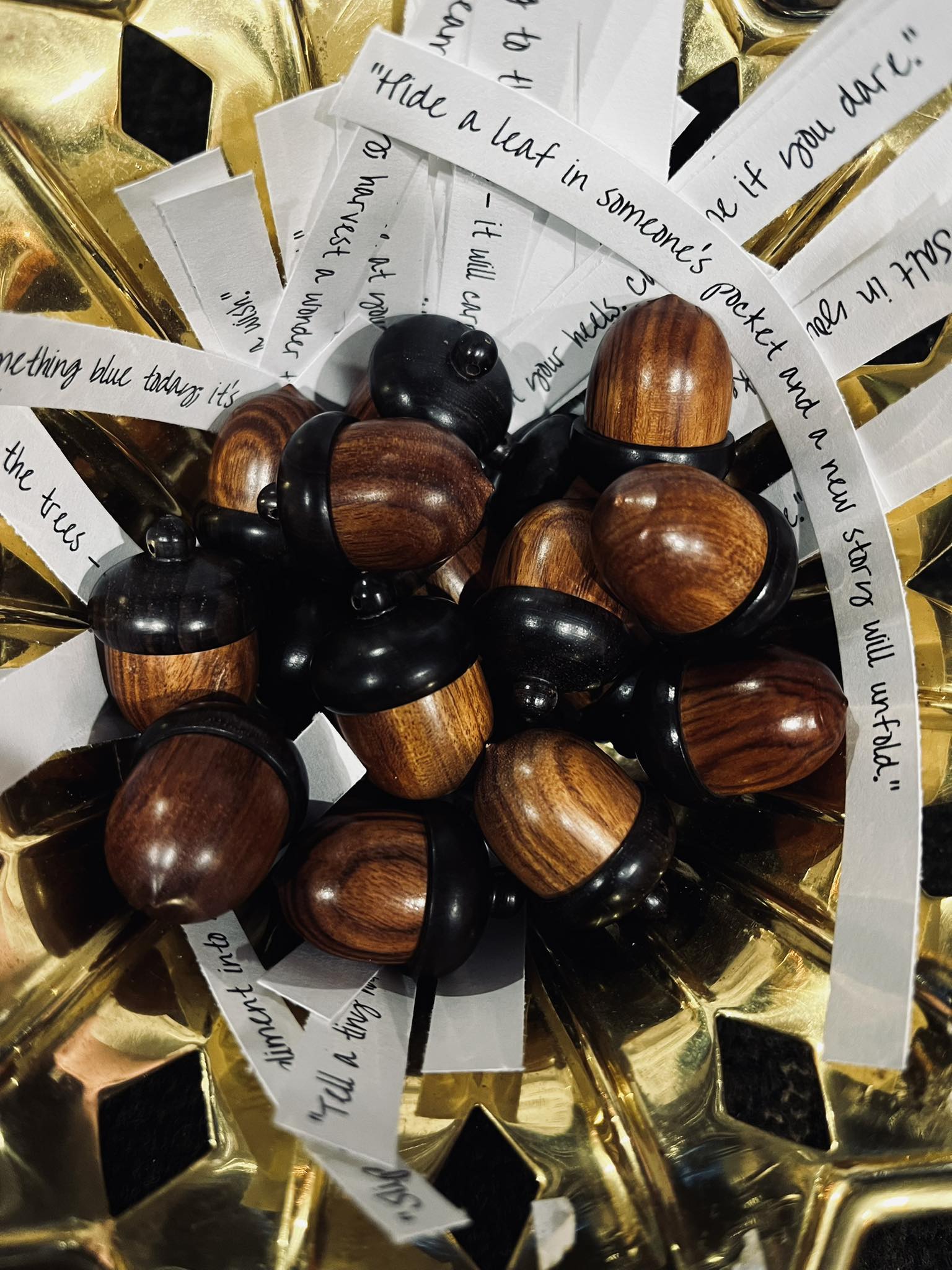 Imagine seeking out a Dryad in an oak grove and asking for a secret- fashioned from ancient oak and polished by unseen hands, these tiny treasures are no ordinary acorns. Hidden within each hallowed heart lies a slip of parchment with a riddle, fortune or a scrap of oldworld wisdom, humor or mystery written in curling script. No two are ever alike. Some hum with luck, others tease with riddles that twist the mind like bramble vines. It is said that those who open their Whisper in the Woods must speak their discovery aloud, lest the magic within wither away like the dew at dawn-!