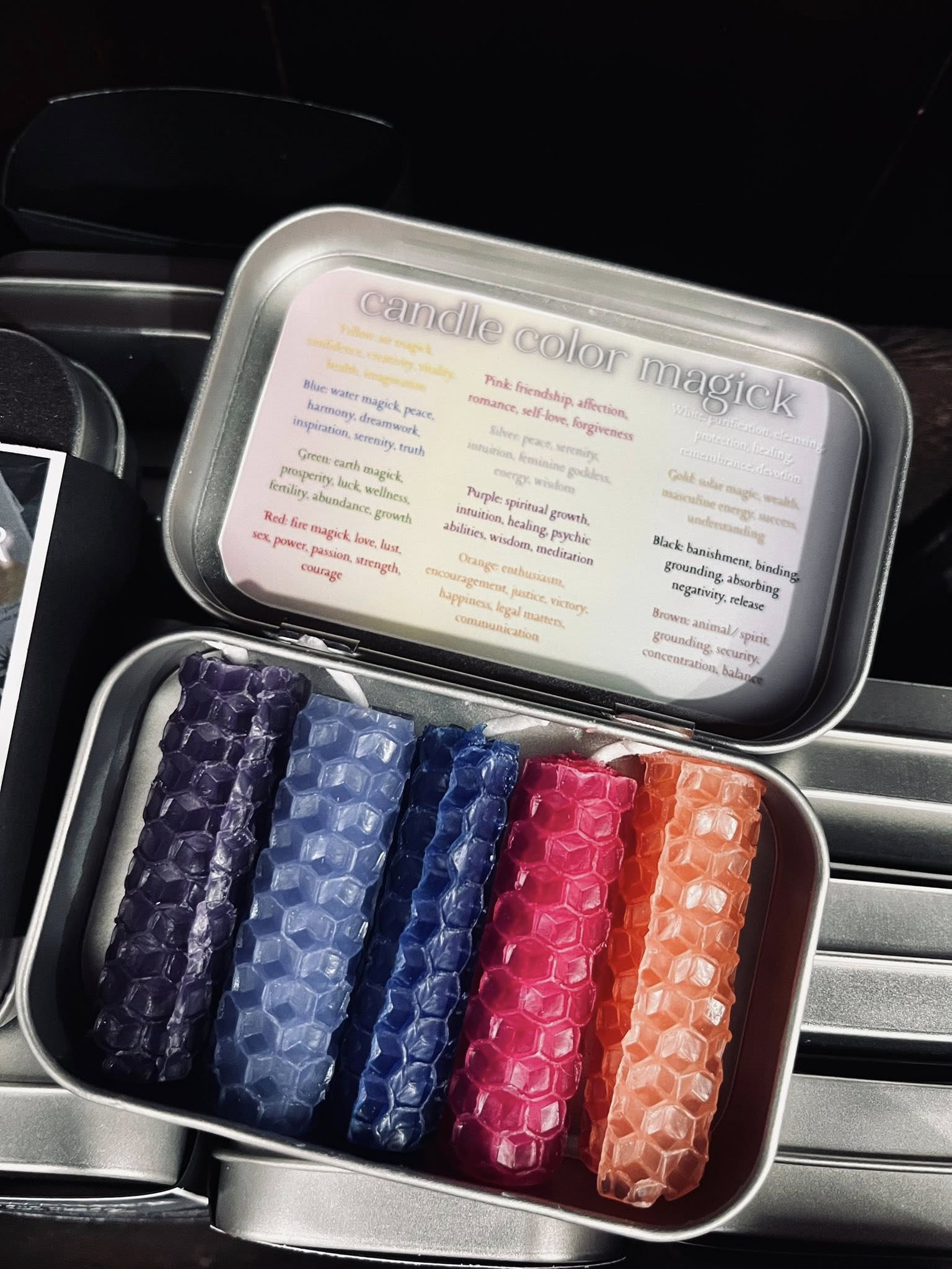 Each tin has an assortment of colors, and a color magick guide- just in case! We select the tin at random for you, or you can build your own and shoot us a message with your color requests for that special and specific intended use.